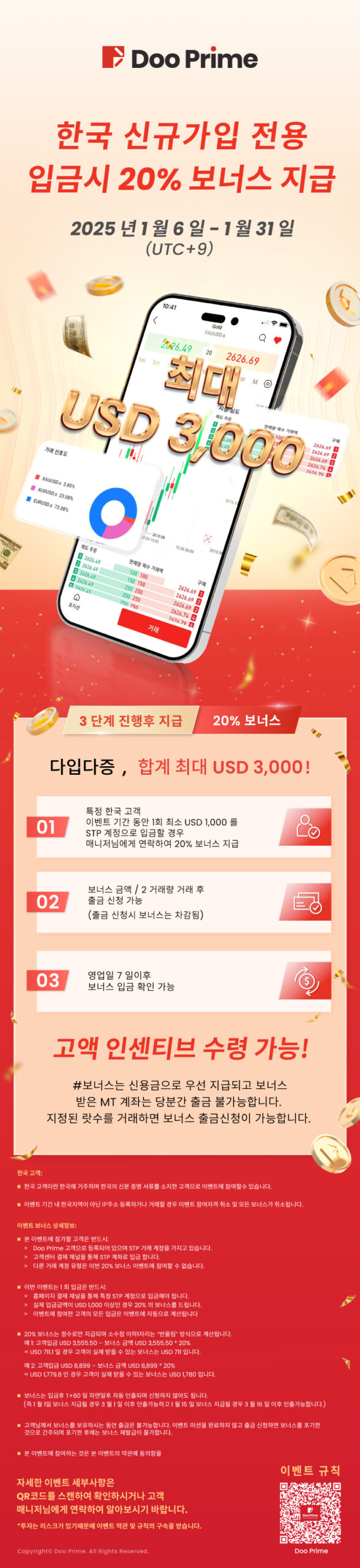 새해를 맞아 Doo Prime 은 한국 고객 여러분의 변함없는 성원과 신뢰에 감사드리기 위해 특별한 혜택 이벤트를 준비했습니다. 이번 이벤트에서는 한국 고객들을 위해 높은 보너스를 제공하여, 더 나은 거래 성과를 이룰 수 있도록 지원합니다.