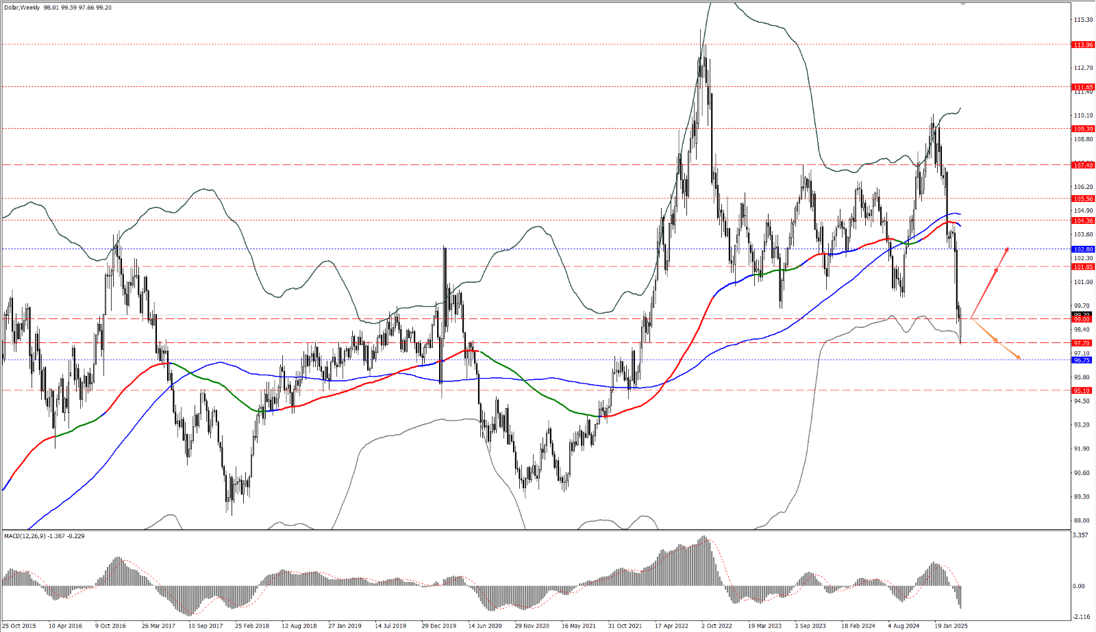 • 如果美指承压回落,并力度跌破 99 一线,则依次关注 97.70 和 96.75 两个位置的支撑力度。