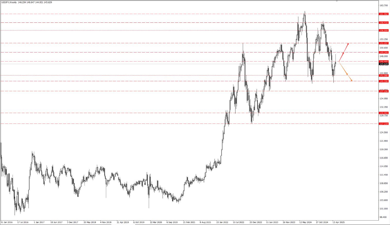 - 上周美元兑日元冲高回落至关键位置 146.44 一线下方,本周依旧关注周多空分届 146.44 一线;