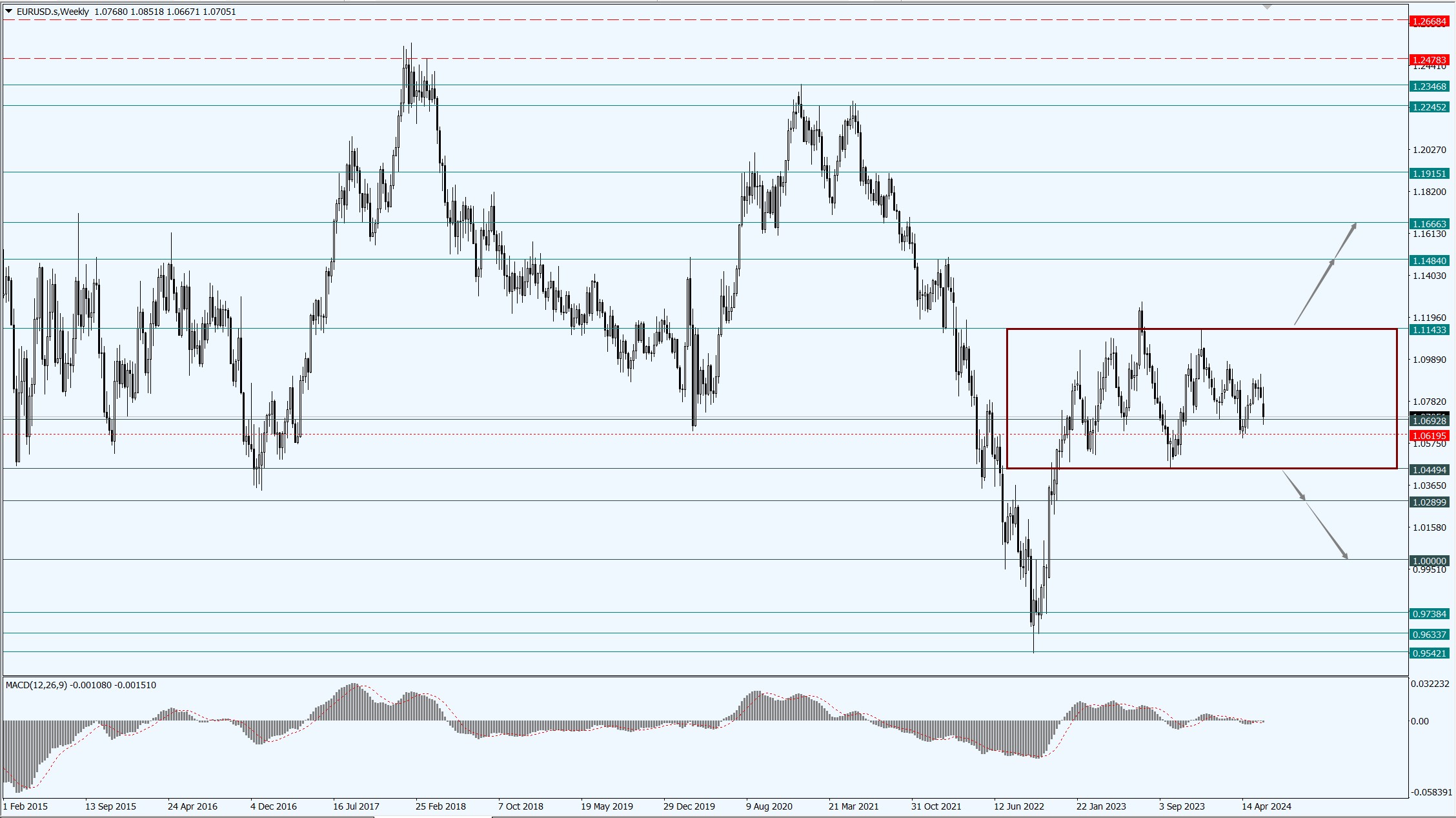 随着法国议会提前选举的临近,市场对新政府可能恶化财政状况的担忧加剧,导致欧元兑美元上周创下两个月来最大单周跌幅,欧洲利差扩大时,欧元往往受到负面影响,因此,欧元兑美元的下跌趋势可能在短期内持续,但需注意市场情绪的变化。