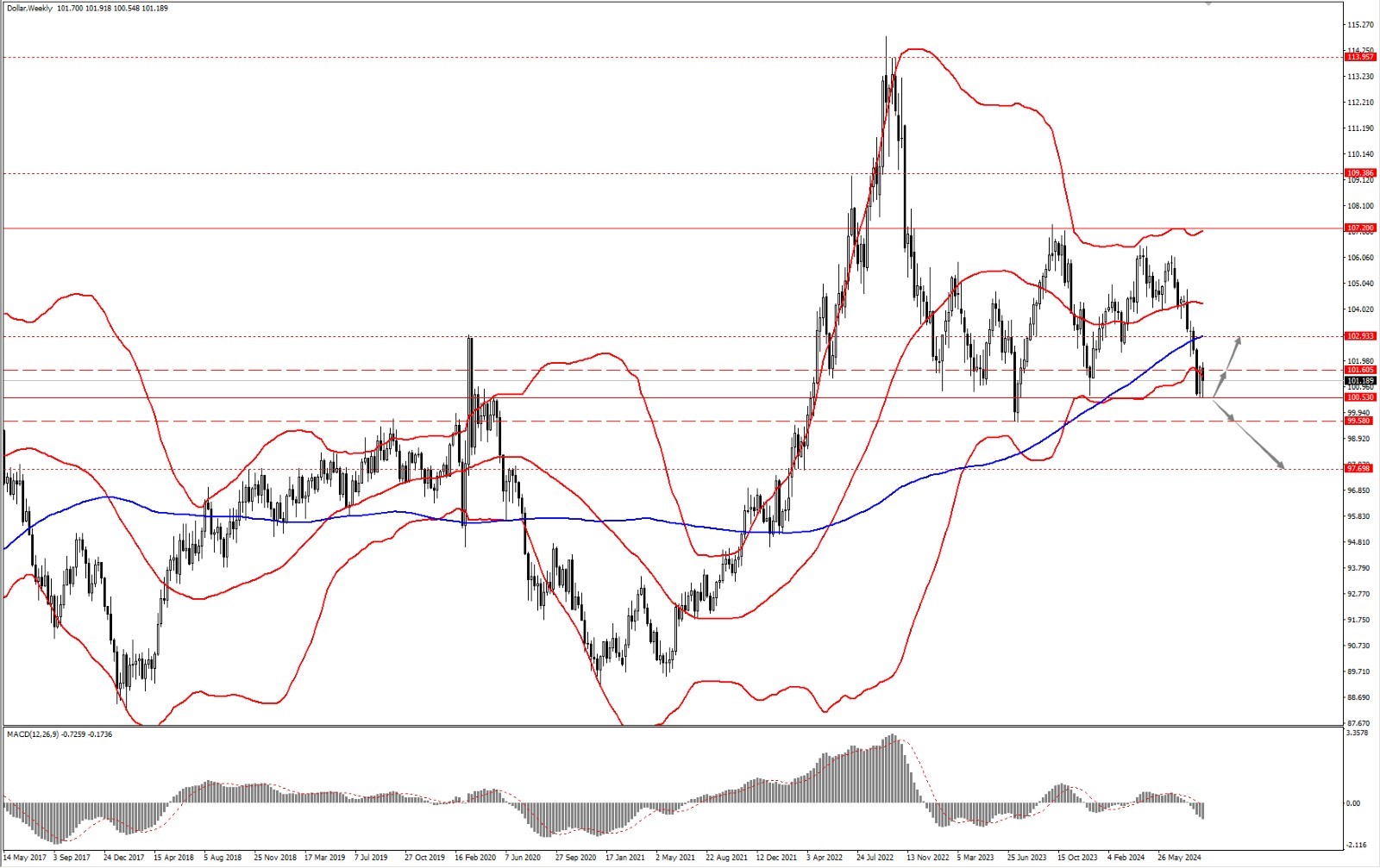 - 如果美指力度跌破 100.53 一线,则依次关注 99.58 和 97.69 支撑力度。