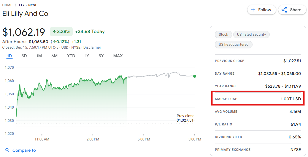 12 月 15 日至 16 日,美国制药巨头礼来 (Eli Lilly)市值一度突破 1 万亿美元,成为全球首家跻身“兆元俱乐部”的制药企业。股价表现反映出其在减重药物市场的爆发式成长。