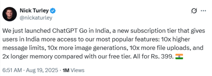 OpenAI 在印度推出最便宜 ChatGPT 订阅方案