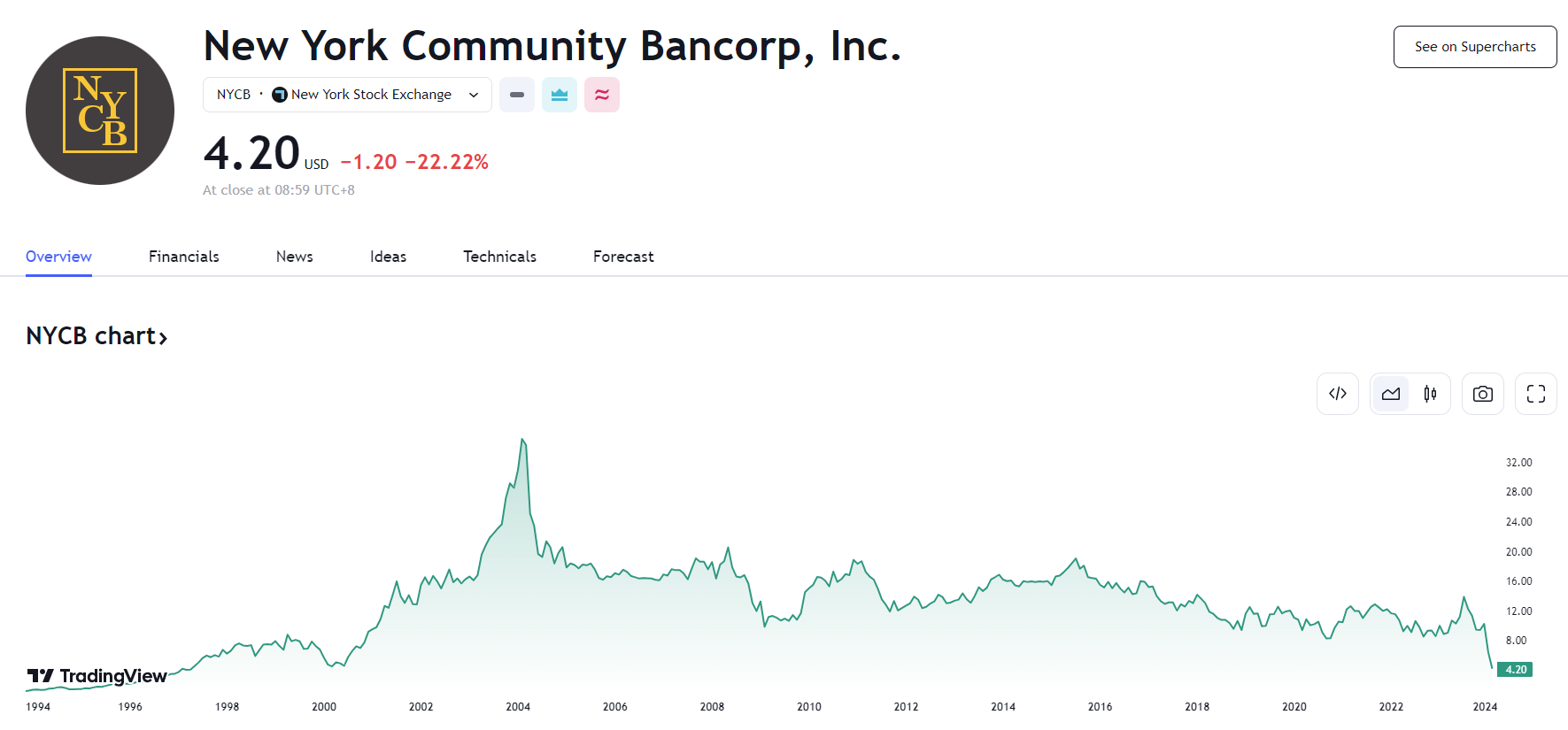 纽约社区银行(New York Community Bank)股价再次暴跌 22.2%,报 4.20 美元,创 1997 年以来收盘新低。自 1 月 31 日公布意外季度亏损和减少股息以来,纽约社区银行的股价已下跌近 60%,市值蒸发约 40 亿美元。