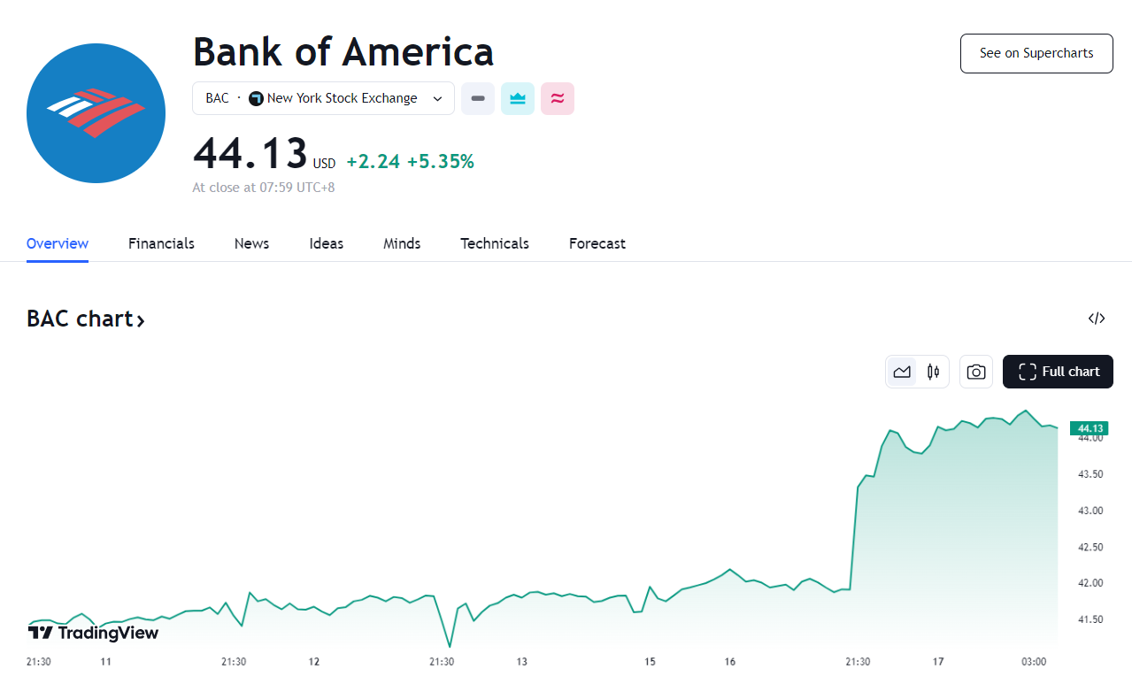 在公布超预期的二季度财报后,美国银行股价大涨了 5.35%。