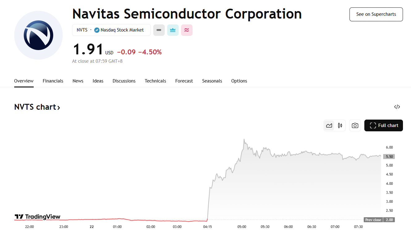 纳微宣布与英伟达合作,盘后股价暴涨超 200%
