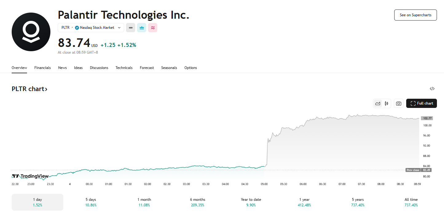 由于第四季度财报超预期,Palantir 周一收盘创下 83.74 美元的历史新高后,盘后交易中又大幅上涨了 24% 以上,刷新历史高位。