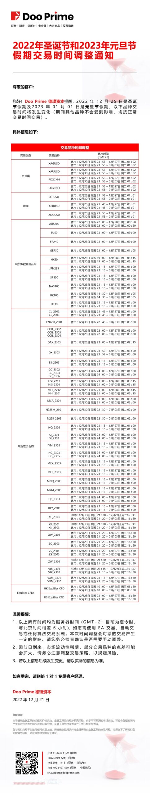 2022 年圣诞节和 2023 年元旦节假期交易时间调整通知