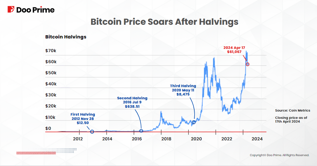 ข้อมูลในอดีตเผยให้เห็นแนวโน้มที่น่าสนใจ คือ ราคา Bitcoin มีแนวโน้มที่จะพุ่งสูงขึ้นหลังจากเหตุการณ์ Halving เราสามารถเห็นได้อย่างชัดเจนในแผนภูมิด้านบน ซึ่งแสดงให้เห็นถึงราคาที่เพิ่มขึ้นอย่างน่าตกตะลึงหลังจาก Bitcoin Halving แต่ละรอบ แม้ตอนแรกราคาจะดูนิ่ง แต่มูลค่าของ Bitcoin ก็เพิ่มขึ้นอย่างต่อเนื่องในช่วงหลายเดือนและหลายปีหลังจากเหตุการณ์ Bitcoin Halving ซึ่งตอกย้ำสถานะของ Bitcoin ในฐานะแหล่งเก็บมูลค่าและสินทรัพย์การลงทุน