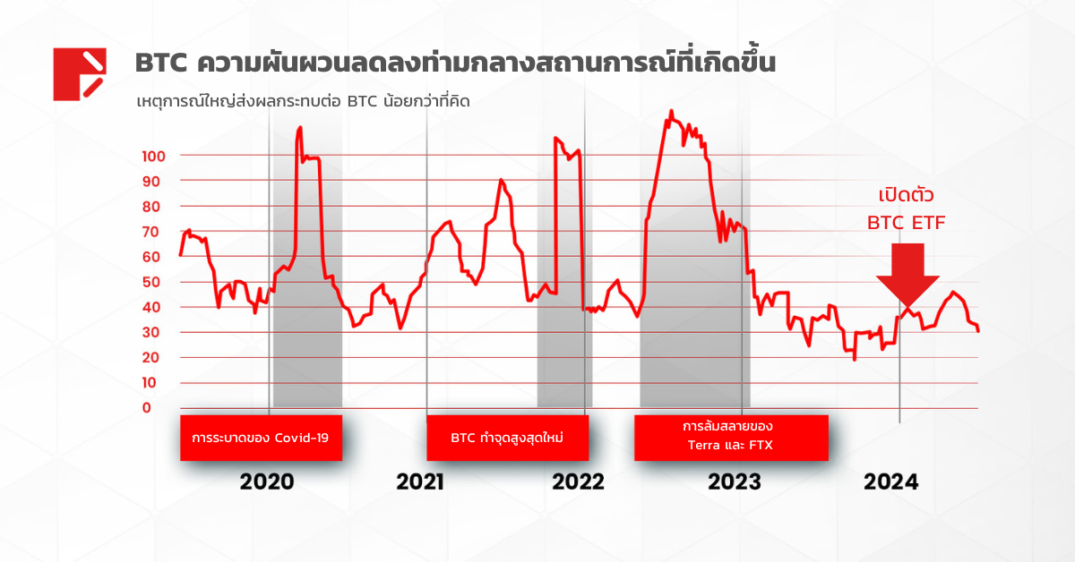 นอกจากนี้ ตั้งแต่ต้นปี 2023 ความผันผวนเฉลี่ยในช่วง 60 วันของ Bitcoin ยังคงต่ำกว่า 50% แม้จะมีผลกระทบอย่างมากจากการเปิดตัวกองทุนซื้อขายแลกเปลี่ยน (ETFs) ก็ตาม ซึ่งเป็นหลักฐานแสดงให้เห็นว่าตลาดกำลังเติบโตขึ้นและได้รับความไว้วางใจมากขึ้นในแต่ละวัน