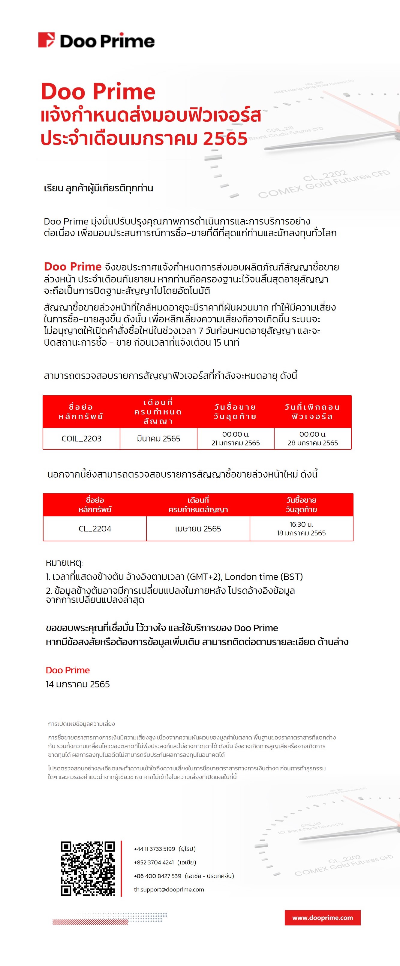 Doo Prime แจ้งกำหนดส่งมอบฟิวเจอร์ประจำเดือนมกราคม 2565