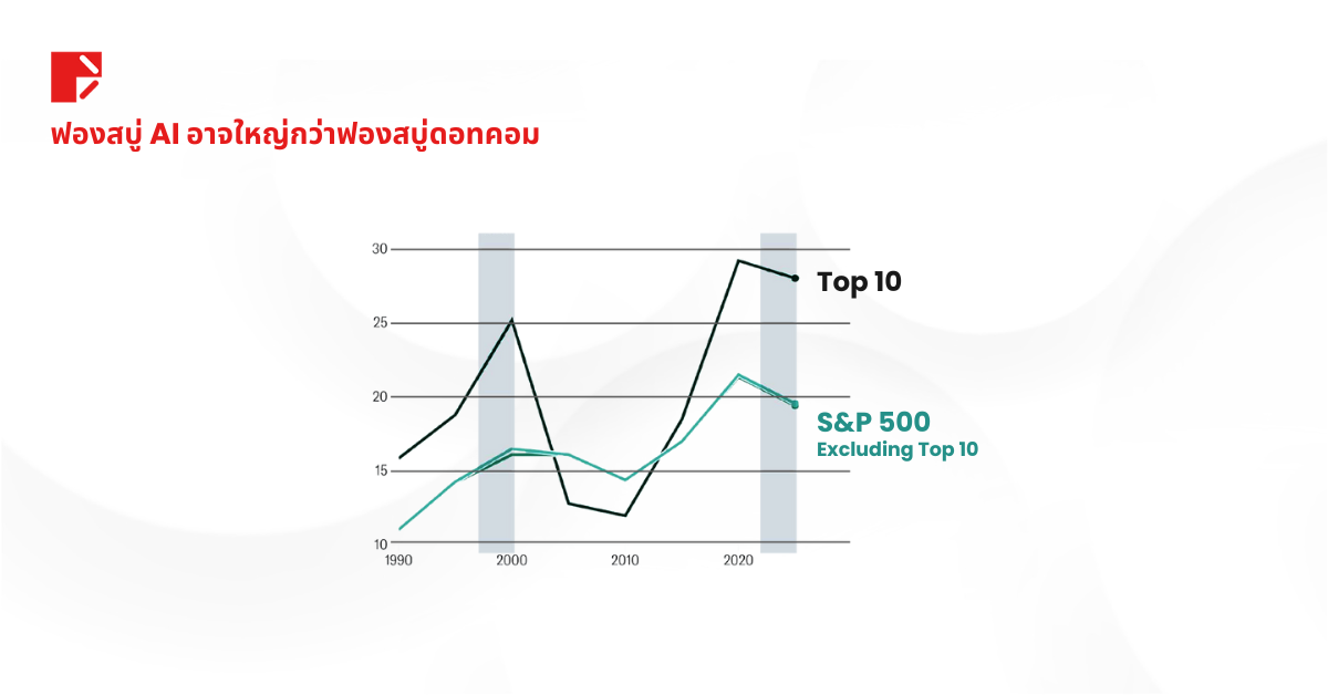 กราฟด้านบนบอกทุกอย่างได้หมด ย้อนกลับไปปี 2000 หุ้น IT ชั้นนำคือผู้สร้างฟองสบู่ และในปี 2025 ก็ดูเหมือนจะเป็นคิวของ AI