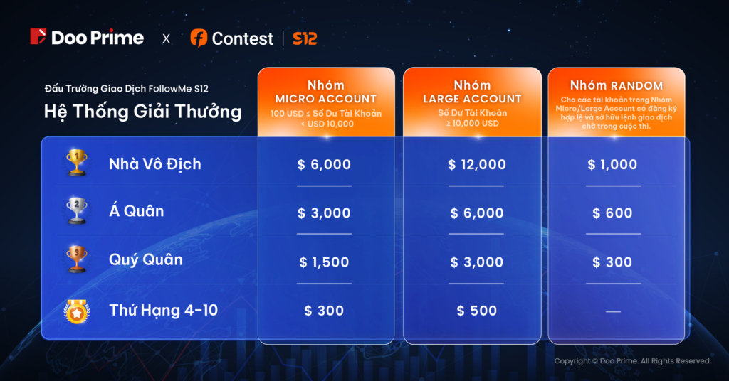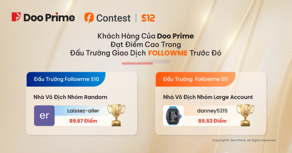 Với sự hỗ trợ từ phía Doo Prime, Đấu Trường Giao Dịch FOLLOWME S12 sẽ mang đến một môi trường phát triển sâu rộng hơn nhằm thể hiện sự đổi mới tài chính cùng các tiến bộ về công nghệ. Thông qua đó, chúng tôi mong muốn sẽ sớm chứng kiến những màn trình diễn đỉnh cao đến từ các “nghệ sỹ” đích thực trong cộng đồng giao dịch trên thế giới.