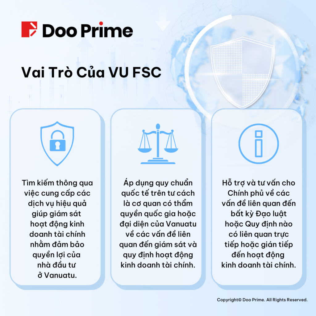 Là nhà môi giới trực tuyến quốc tế, Doo Prime thực hiện các hoạt động kinh doanh dựa trên văn hóa “Đặt khách hàng làm ưu tiên hàng đầu”. Chính điều này đảm bảo sự an tâm từ ngay trong nhận thức của các nhà đầu tư, rằng chính họ sở hữu quyền được biết về các giấy phép tài chính khi tham gia giao dịch tại một công ty bất kỳ. Trong bài viết này, Doo Prime sẽ chia sẻ về Giấy phép Đại lý Tài chính được cấp bởi một trong những cơ quan quản lý tài chính hàng đầu trên thế giới – Ủy ban Dịch vụ Tài chính Vanuatu (VU FSC).