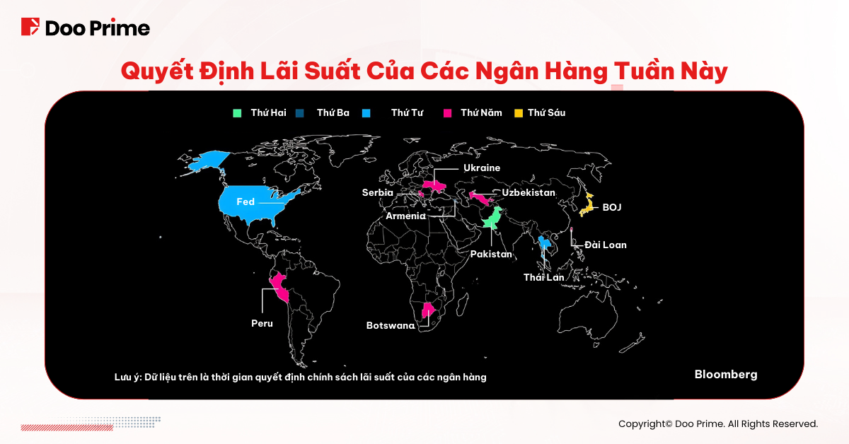 Trong tuần này, một số NHTW trên toàn cầu, bao gồm Pakistan, Armenia, Thái Lan, Serbia, Ukraine, Uzbekistan, Peru và Botswana, sẽ tiến hành các cuộc họp về chính sách tiền tệ. Nhưng mọi ánh mắt đều hướng về Fed của Mỹ và Ngân hàng trung ương Nhật Bản (BoJ).