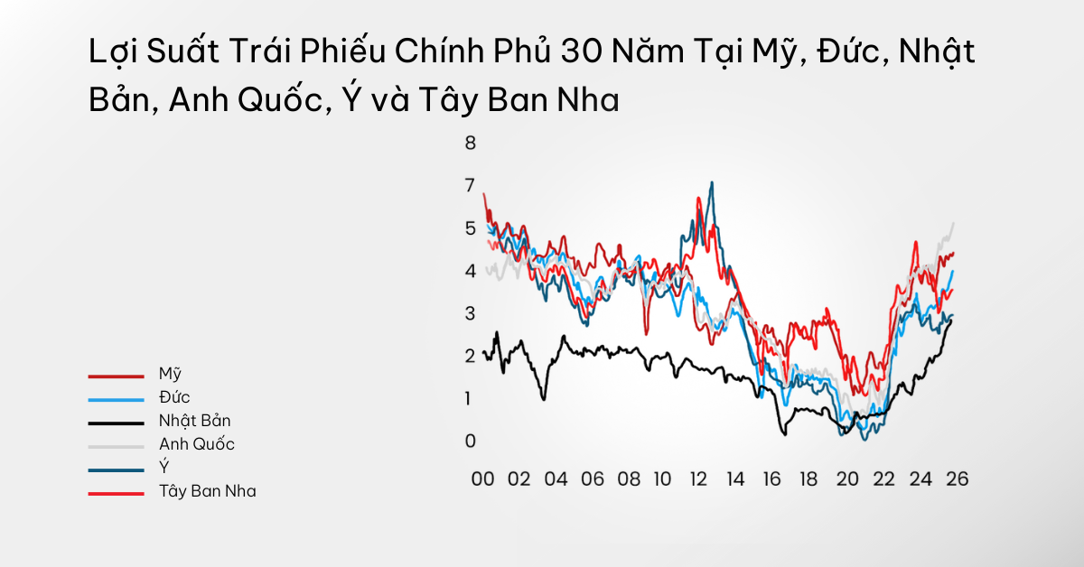 Lợi suất trái phiếu chính phủ trong 30 năm tại Mỹ, Đức, Nhật Bản, Anh Quốc, Ý và Tây Ban Nha
