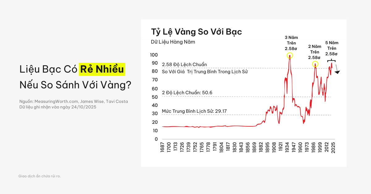 Biểu đồ tỷ lệ vàng/bạc cho thấy cần bao nhiêu ounce bạc để mua được một ounce vàng. Trong lịch sử, tỷ lệ này thường thấp hơn đáng kể so với mức hiện tại.